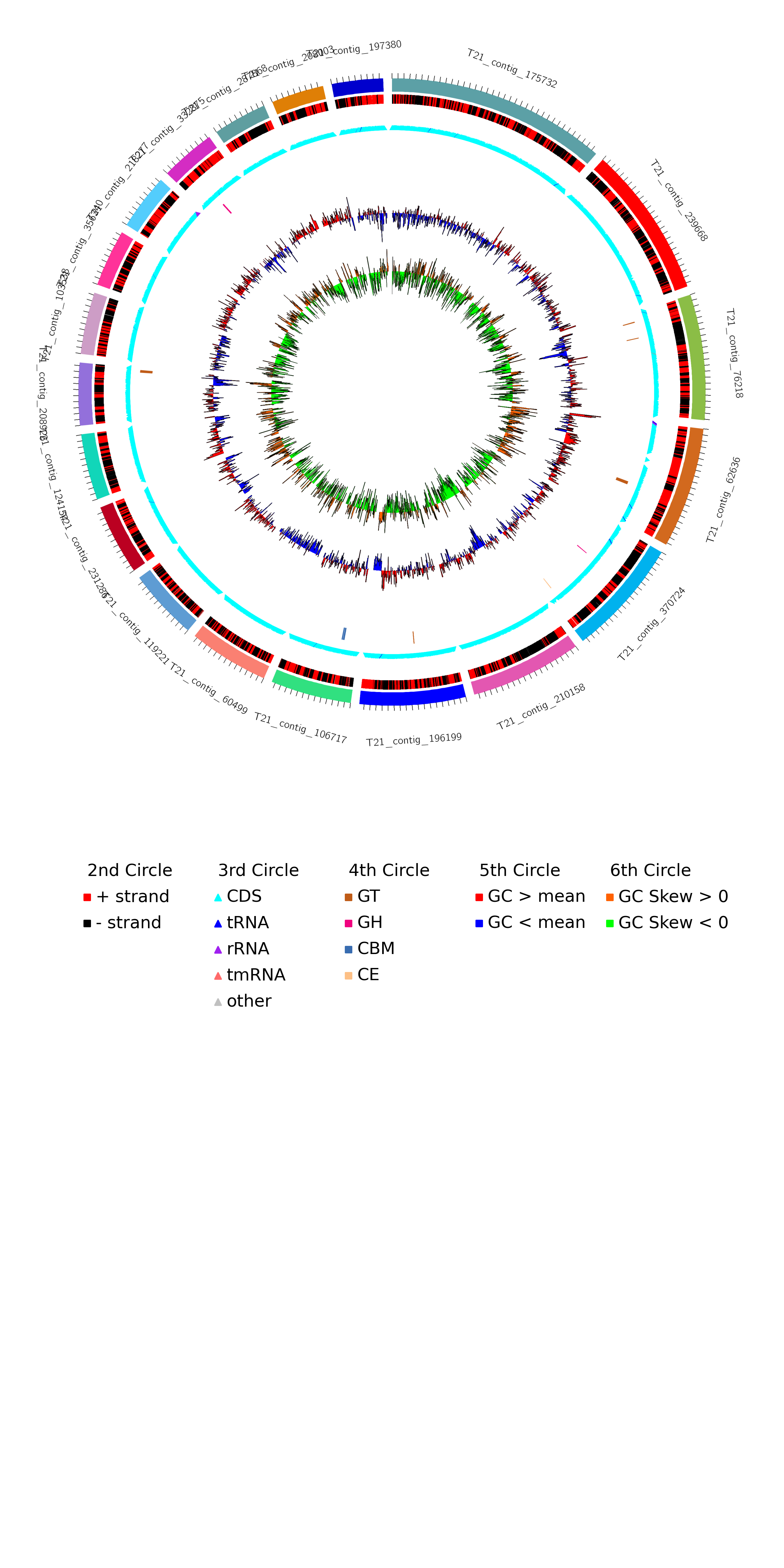 由于图片篇幅限制,图中只展示了长度最长的20条contigs。从外到内,第一圈表示属于该MAG的contigs,长度用刻度表示,单位为bp;第二圈用不同颜色区分contigs上的正链和负链;第三圈用不同颜色的三角标出tRNA, rRNA, tmRNA以及CDS(编码蛋白)的编码区;第四圈标注CDS注释到CAZy数据库的碳水化合物活性酶分类,如果没有注释到任何基因,该圈可能为空;第五圈标注contigs分段(每1kb)GC含量,其中用不同颜色区分大于和小于所有contigs分段GC含量总平均值;第六圈标注contigs 分段(每1kb)GC skew值,大于和小于0用不同颜色区分。